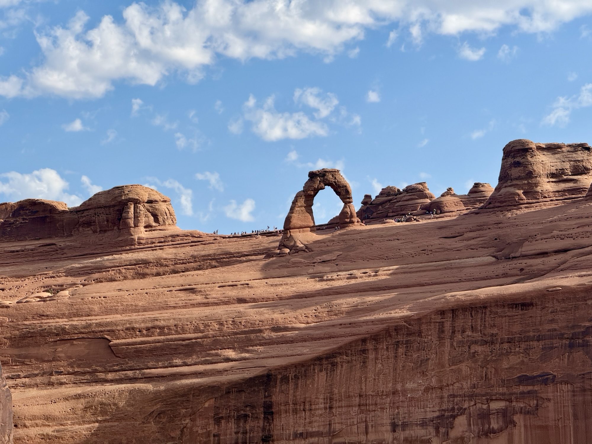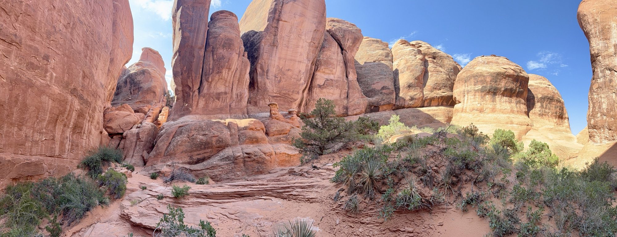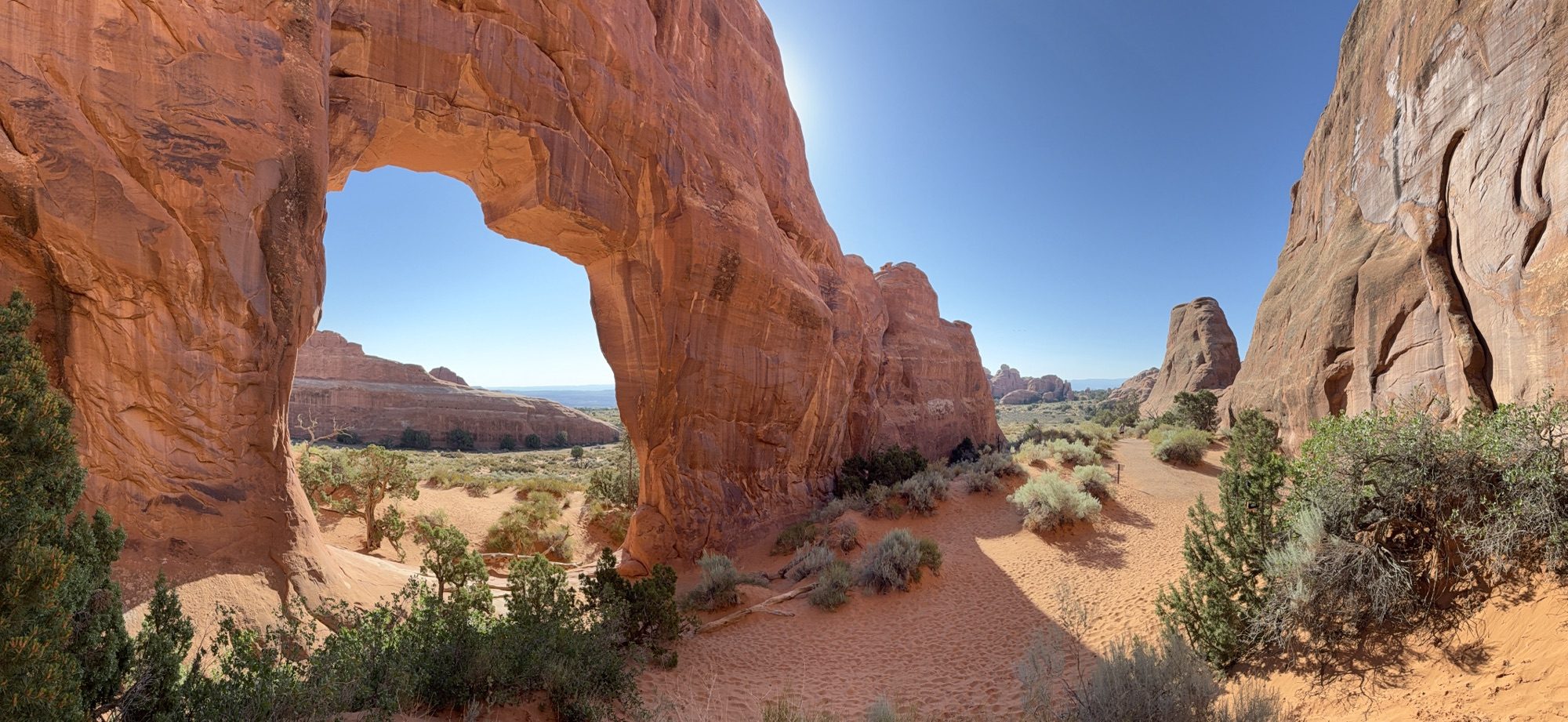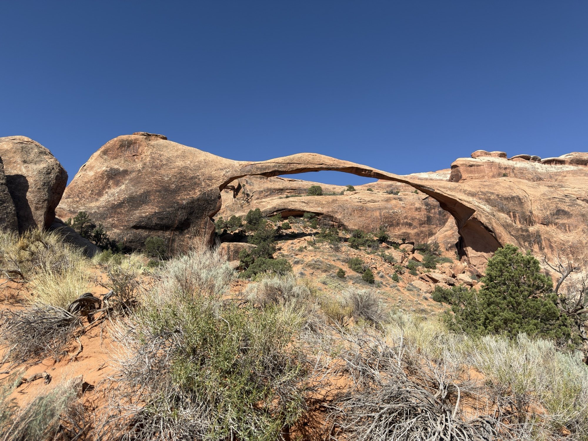 Delicate Arch is the park’s iconic landmark—it’s featured on Utah license plates, serves as a symbol of Moab, and is often used to represent the state itself. Its freestanding nature makes for striking photos and an unforgettable sight. That said, my personal favorite is Landscape Arch. Its long, narrow span and delicate structure beautifully frame the surrounding scenery, offering a different kind of wonder.