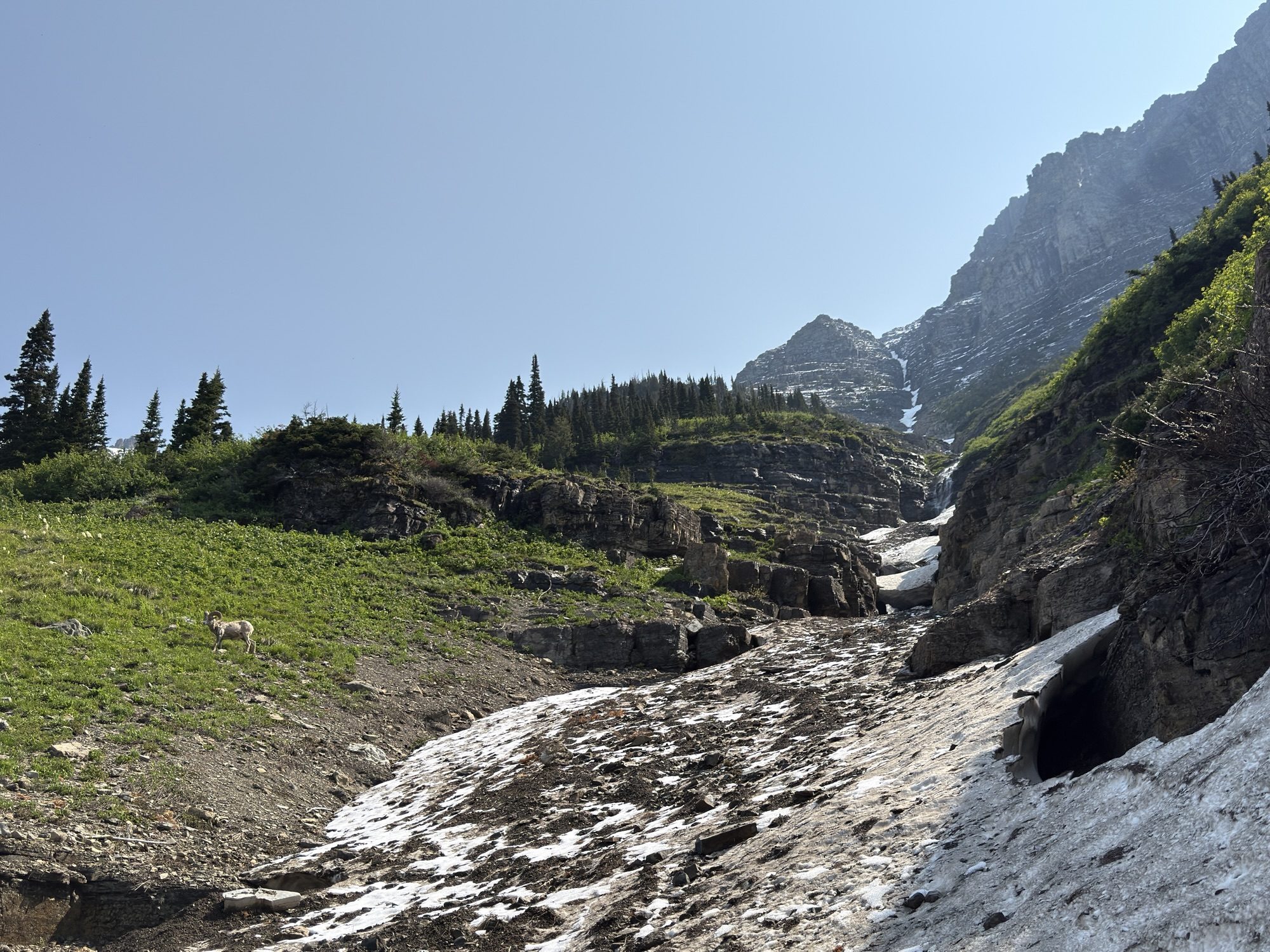 At Logan Pass, the highest point on the road, snow and ice still cling to the landscape—even in late June. I was incredibly lucky to spot a bear emerge from the forest and wander onto a snowfield, the contrast making it easy to see and unforgettable to witness.