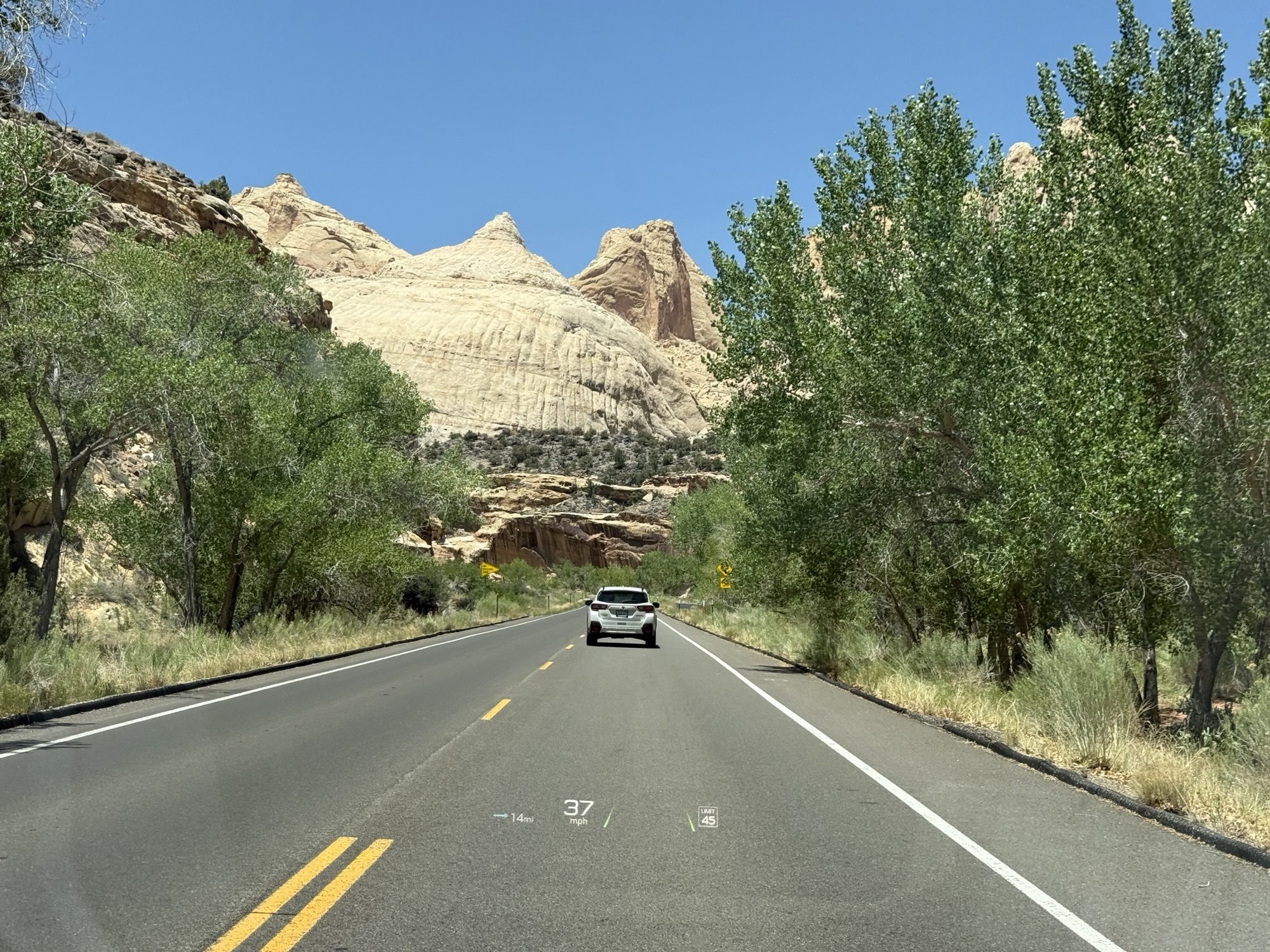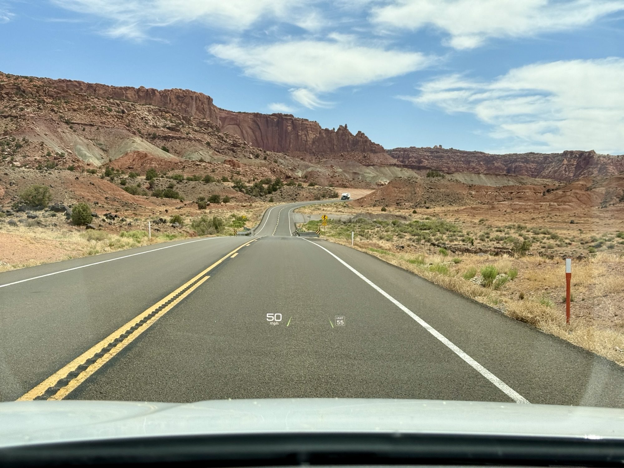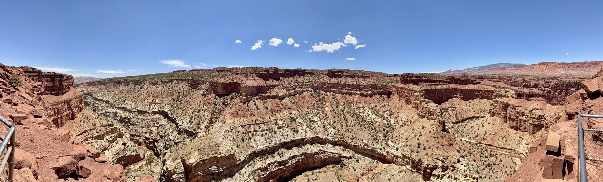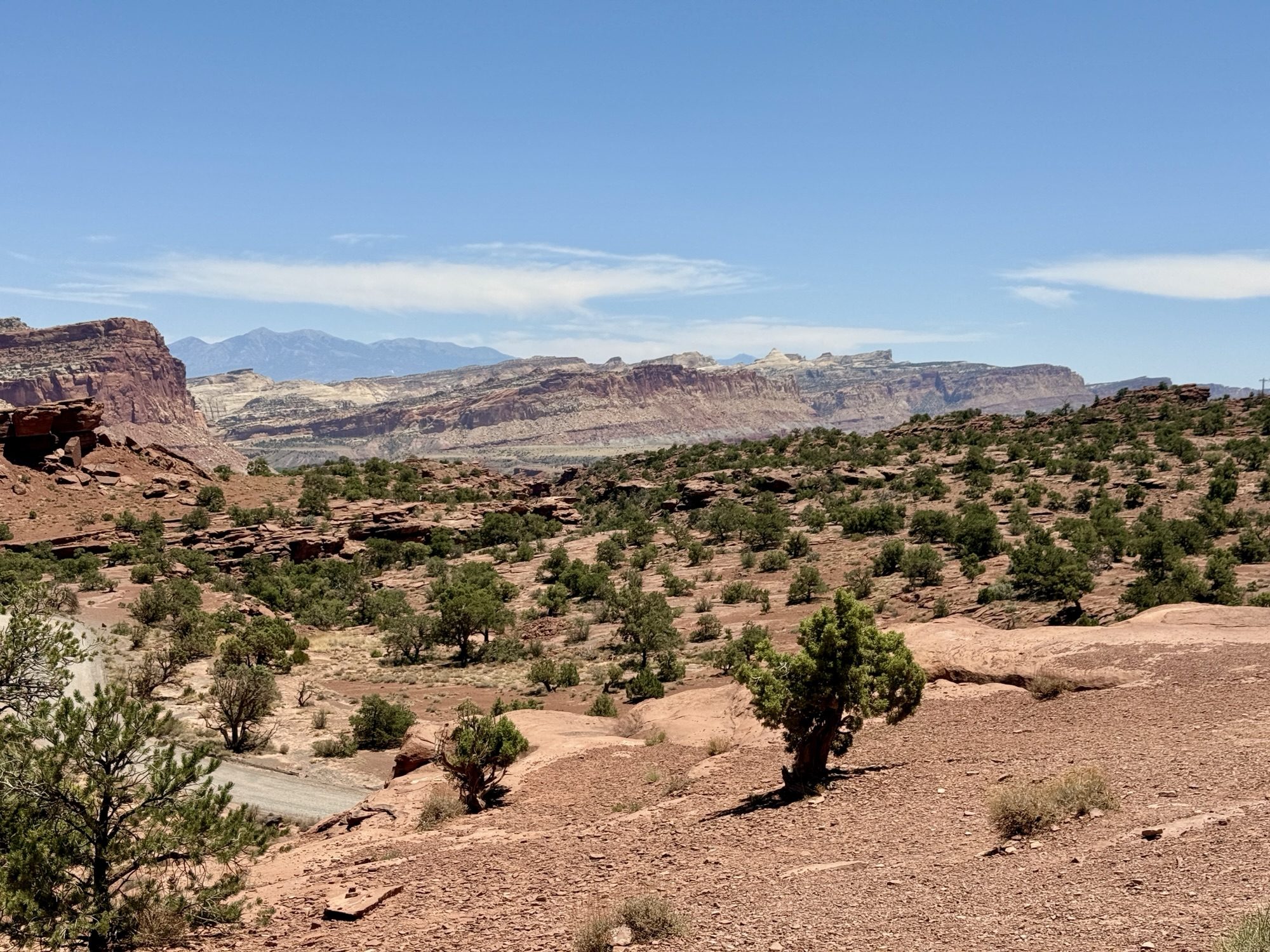 I didn’t make it to Canyonlands National Park this time—something for the next trip—but instead headed toward Capitol Reef National Park. The drive itself felt like a journey across Mars, with rust-colored cliffs and winding canyons framing the road on both sides. One particularly scenic stop along the way was Goosenecks Overlook, offering a sweeping view that’s hard to put into words.